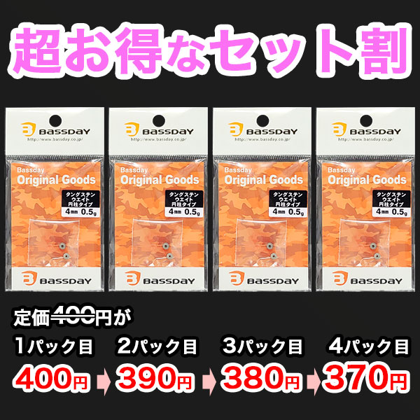 タングステンはレアメタルですので、少し高価ですが、ルアーバンクではセット割りで対応。2パック目→3パック目と複数購入でお安くなります♪数を必要とする場合もお得に購入が可能です♪