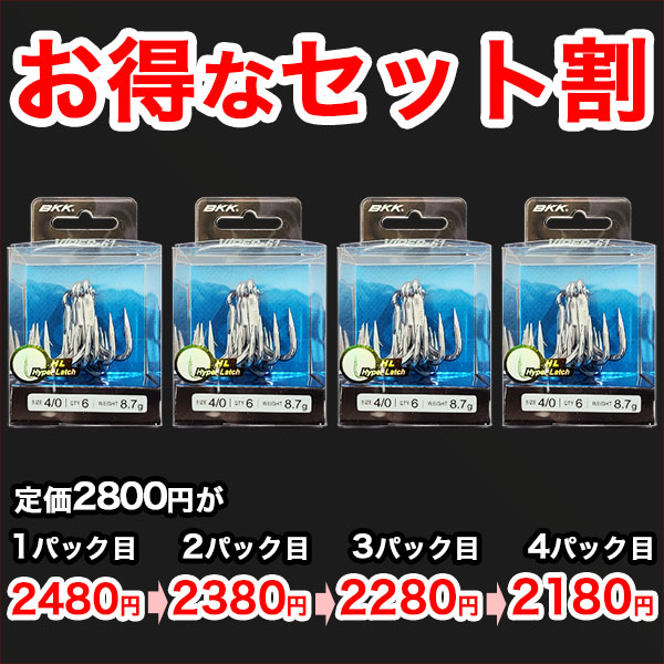 | 備考 | 【メーカー】BKK Japan 【商品名】VIPER61(ヴァイパー61) ※バイパー61とも呼ばれています 【仕様】UA(ウルトラアンチラスト) ※錆びに非常に強いソルト対応コーティング 【線径】6X(太軸) ※オーナー(カルティバ)のSTX-68相当の太軸フックです 【対象魚】モンスターフィッシュ専用 大型ヒラマサ・キハダ・クロマグロ・GT等 【サイズ (入数) 重量】 4/0 (6本) 約8.7g 5/0 (5本) 約11.6g 6/0 (5本) 約15.2g 7/0 (4本) 約18.8g ※重さはパッケージ記載のものです。 ※実物サイズやルアー使用例はこちら |