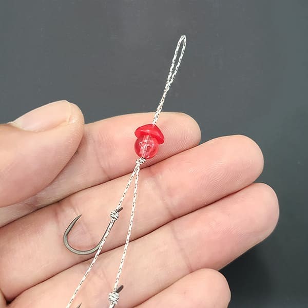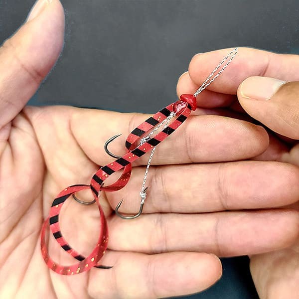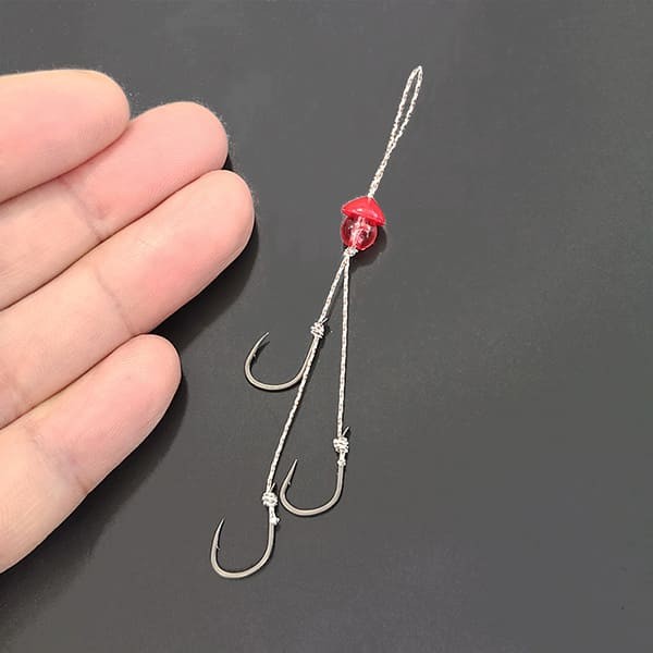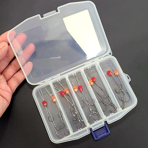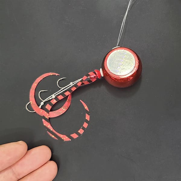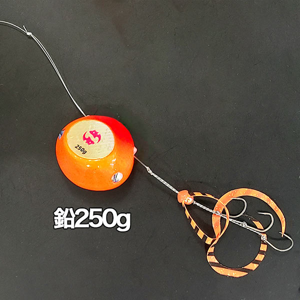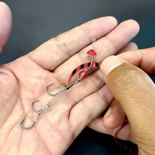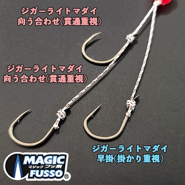 フッ素コートで貫通性能に優れた、ジガーライトマダイ向う合わせ(貫通重視)2本と、ジガーライトマダイ早掛(掛り重視)1本の3本針の複合仕掛けで