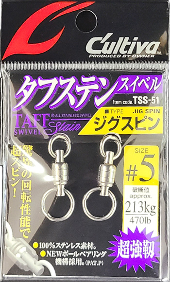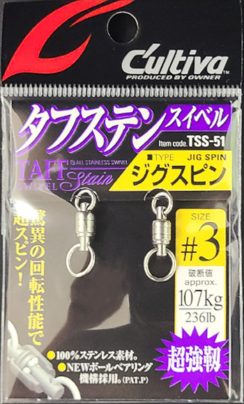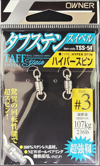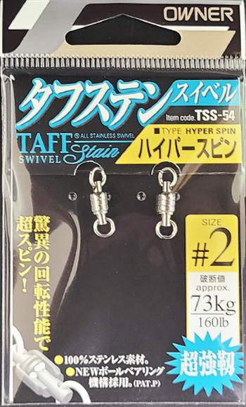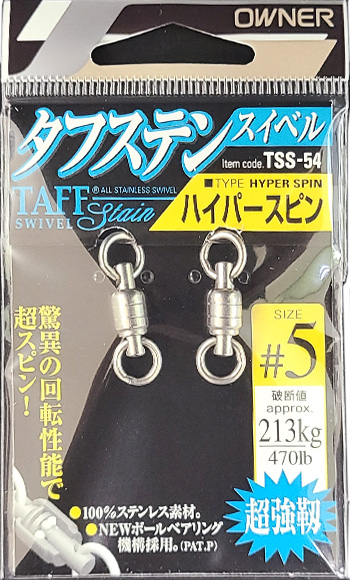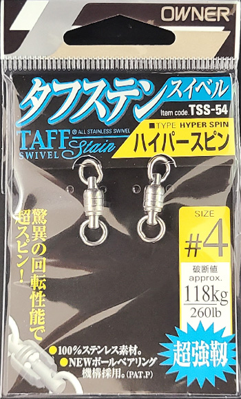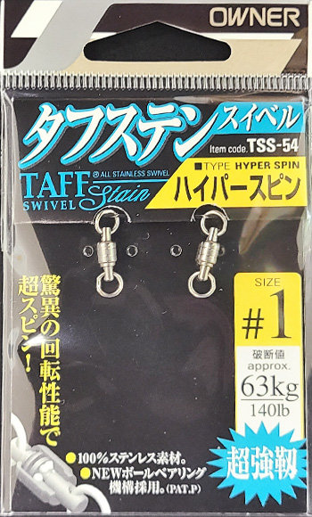 | 備考 | 【メーカー】カルティバ(オーナー) 【商品名】 タフステンスイベル「ハイパースピン」 タフステンスイベル「ジグスピン」 【サイズ】ハイパースピン #1:140lb(63kg) #2:160lb(73kg) #3:236lb(107kg) #4:260lb(118kg) #5:470lb(213kg) ※両方の溶接リングが小さく、キャスティングロッドのトップガイドに通ります。 【サイズ】ジグスピン #1:140lb(63kg) #2:160lb(73kg) #3:236lb(107kg) #4:260lb(118kg) #5:470lb(213kg) ※片方の溶接リングが大きく、大きいスプリットリングでルアー(ジグ)を接続したい方におすすめです。 |