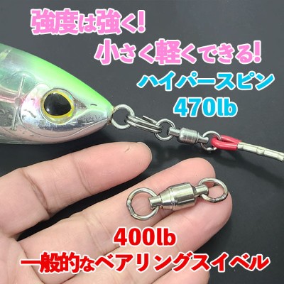 ハイパースピンはリングが両方とも小さい為、キャスティングロッドであらかじめ、スイベルを組んでおいても、トップガイドを通すことが可能です。強いスプリットリングを使いたい場合、小さくて強力な「楕円形のスプリットリング」と相性がいいです。