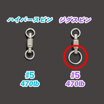ジグスピンは、片方の溶接リングが大きく、ルアー(ジグ)との接続で大きなスプリットリングを使いたい場合に重宝します。