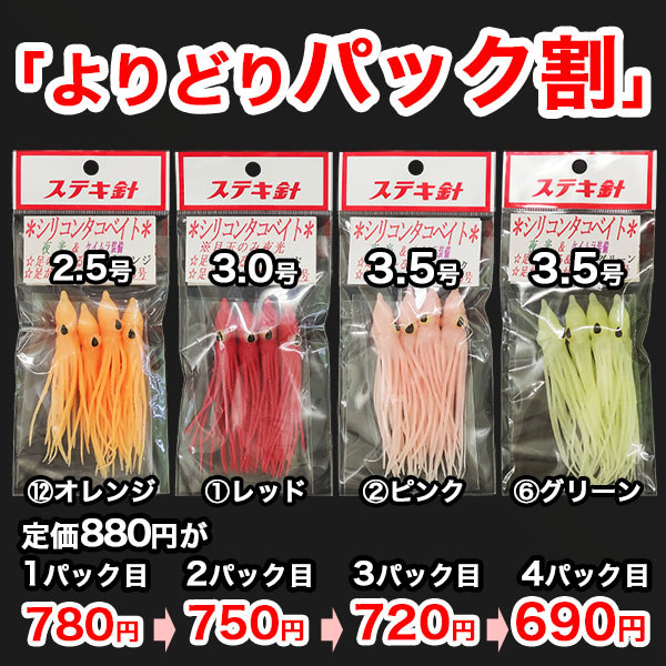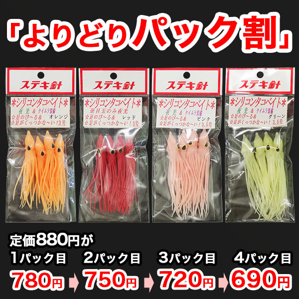 ルアーバンクでは、シリコンタコベイト1パック(4匹入)を、お好きな色、お好きなサイズの組み合わせの複数パックで、どんどんお得に購入が可能です♪もちろん同じカラー、同じサイズが混ざっても大丈夫!