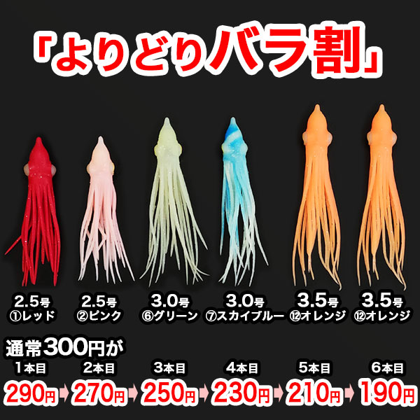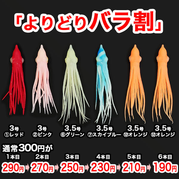 ルアーバンクでは、シリコンタコベイト1匹単位でのバラ販売も開始しました。お好きな色、サイズの組み合わせで1匹単位でお得に購入が可能です♪もちろん同じカラー、同じサイズが混ざっても大丈夫!